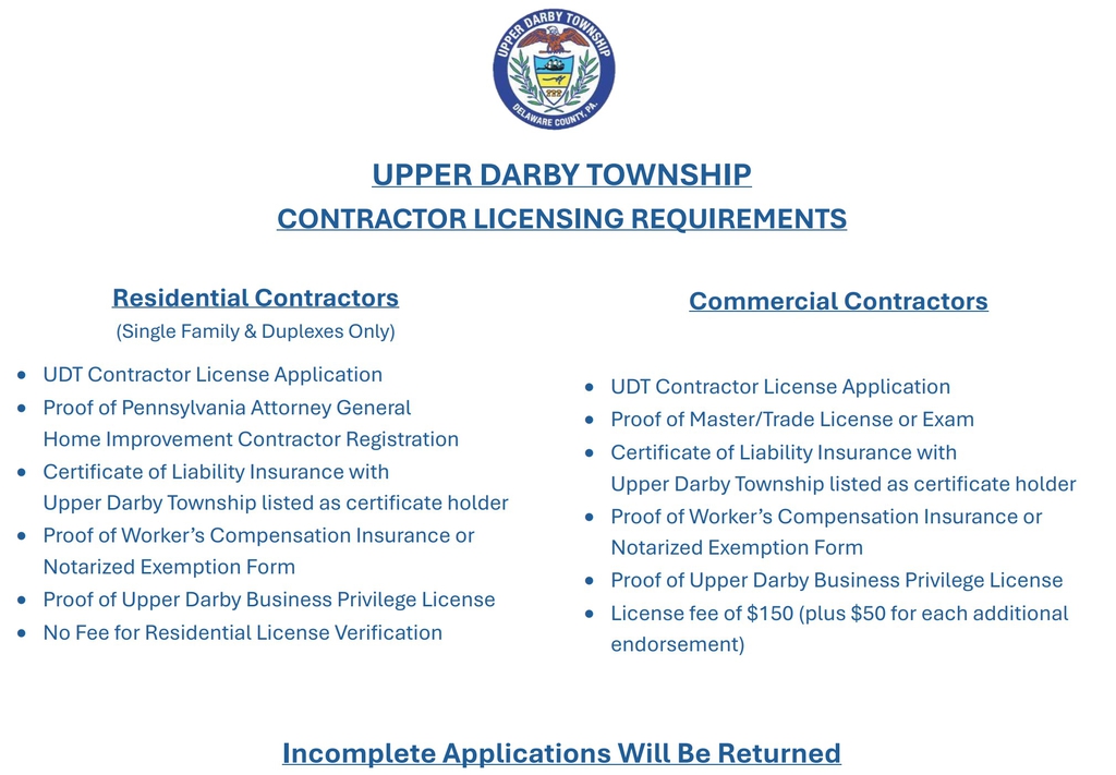 Complete applications can be emailed to LI@upperdarby.org with online at upperdarby.org/codepay or mailed to the office with a check or money order for the appropriate fee.