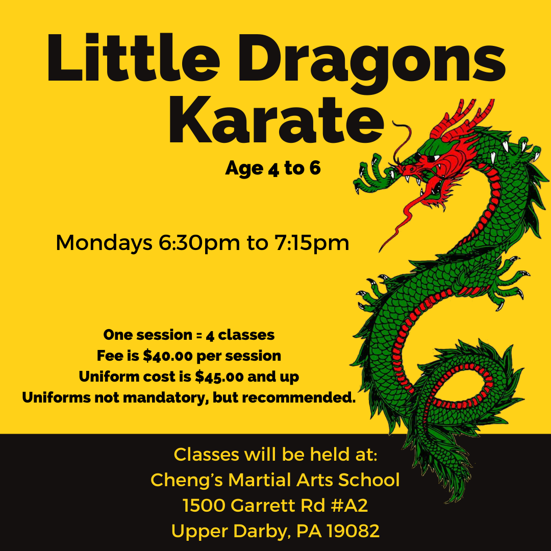 | LITTLE DRAGONS KARATE (Age 4-6) - Our Dragons programs are specially designed with our youngest martial artist in mind. The developmentally appropriate curriculum includes building on large motor skills, enhancing communication and language and improving balance and coordination - all while introducing students to the martial arts. Begin building your child’s independence and self-confidence today! Classes are held on Monday, 6:30pm to 7:15pm. |