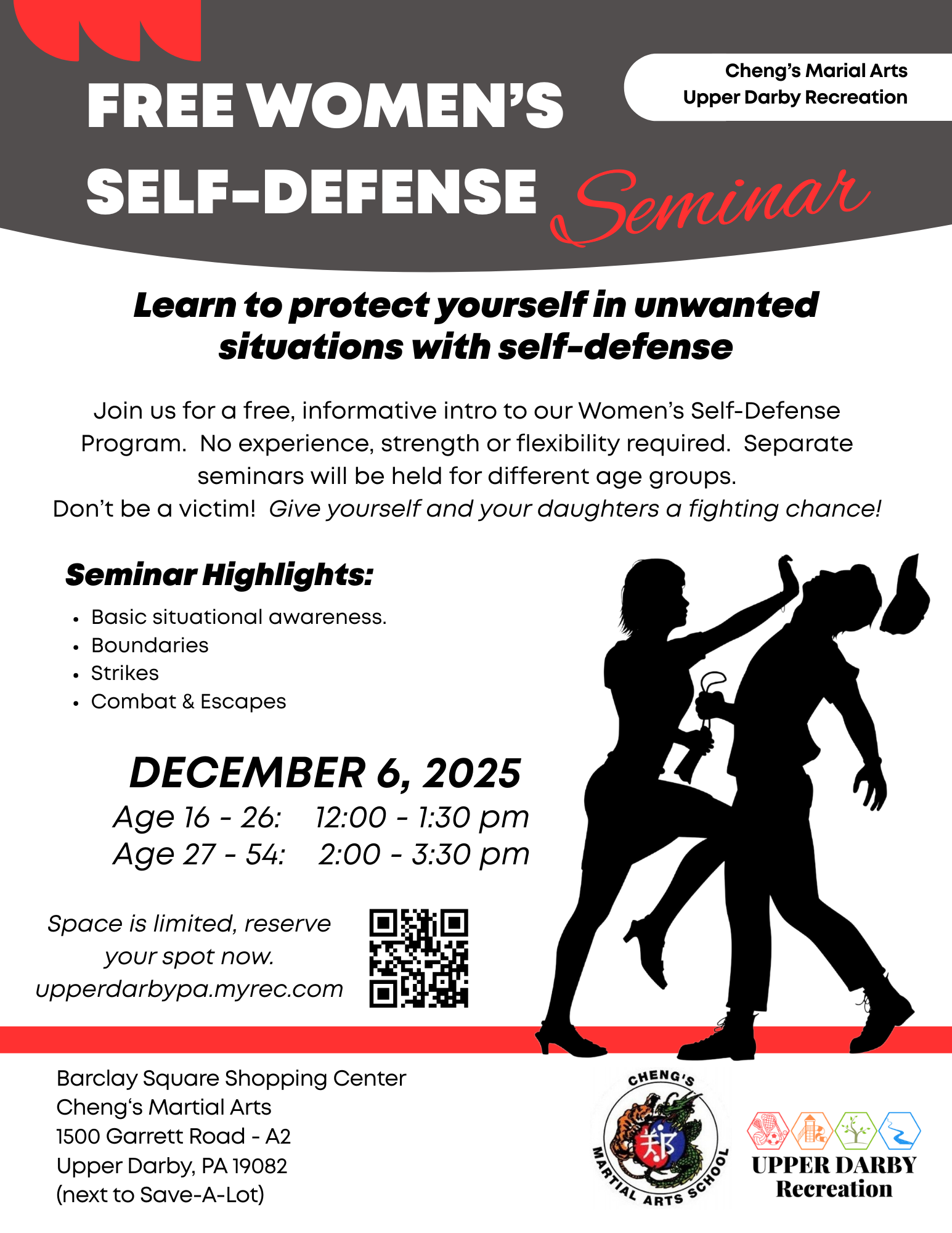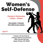 | WOMEN'S SELF-DEFENSE (age 17+) - No experience, strength or flexibility required. We will focus on Stances, Straights, Kicks, and Target Area. Don’t be a victim! Give yourself and your daughters a fighting chance! Classes are held Monday & Wednesday, 7:30pm - 8:30pm. |