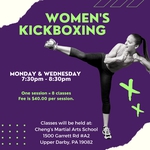 | WOMEN'S KICKBOXING - A great workout for anyone interested in improving their fitness & stamina. This class is flexible and adaptive so that it serves the needs of all participants - it will get beginners into shape & it will challenge advanced athletes. The class format integrates combinations of punches, kicks and heavy-bag work. Additional muscle and motion exercises are incorporated to strengthen and tone. You will have fun, reduce stress and get an awesome workout. Please wear comfortable clothes. Classes are held on Monday & Wednesday, 7:30pm - 8:30pm. |