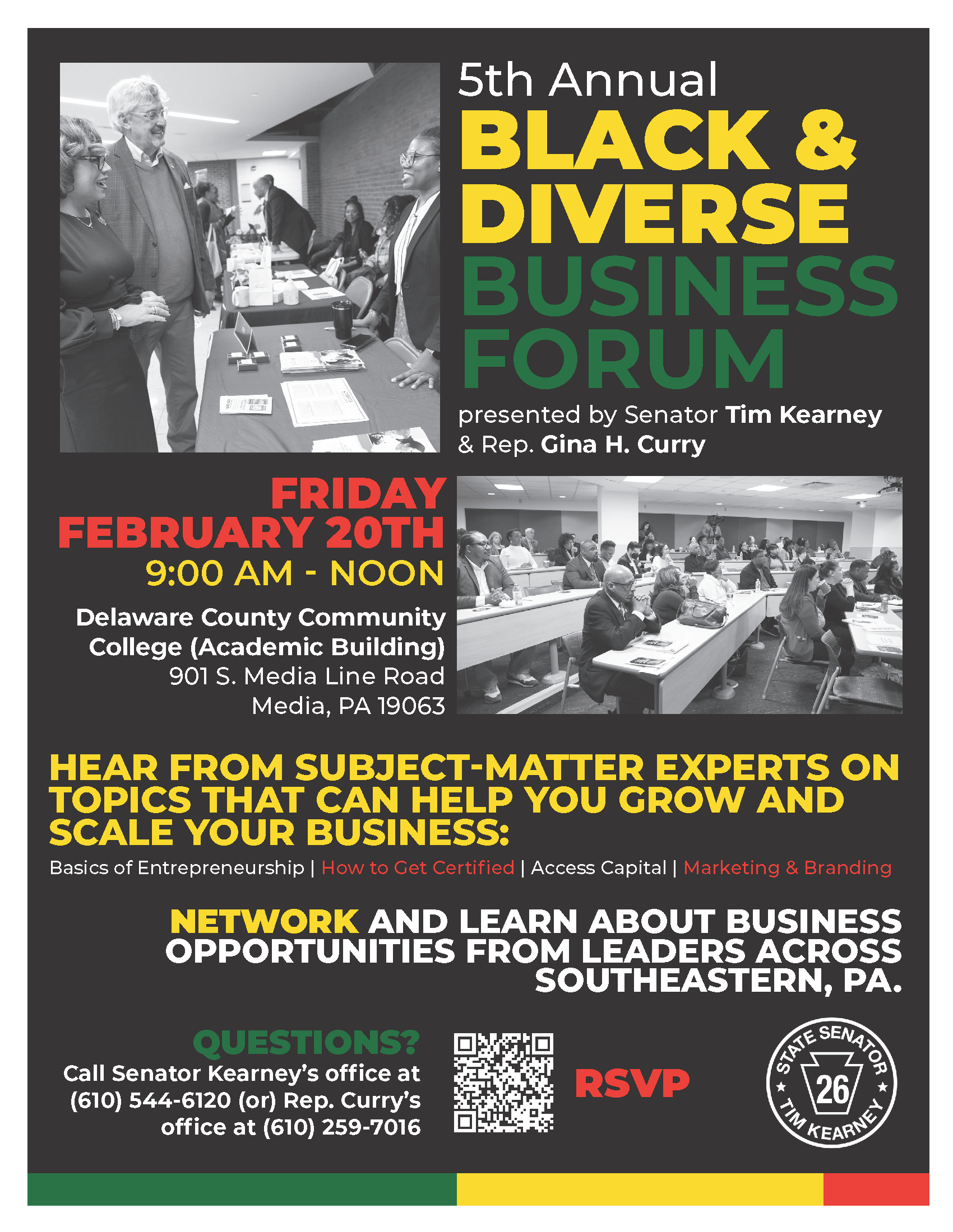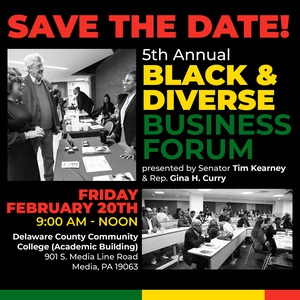 Rep. Gina H. Curry and I are excited to share that our 5th Annual Black & Diverse Business Forum will be held on Friday, February 20 at Delaware County Community College.