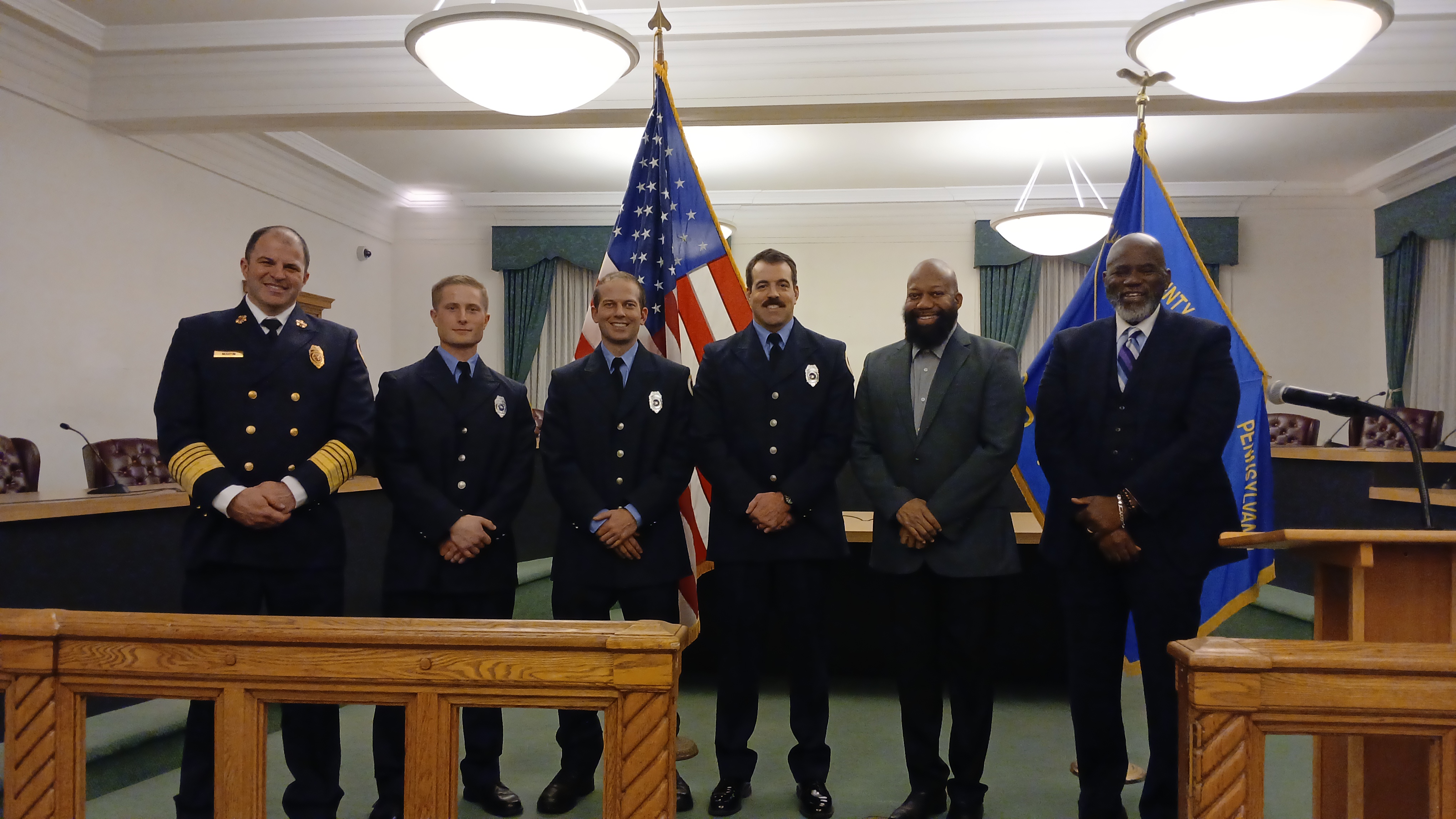 Upper Darby Mayor Ed Brown swore in three new Township firefighters on Monday, December 15, 2025.