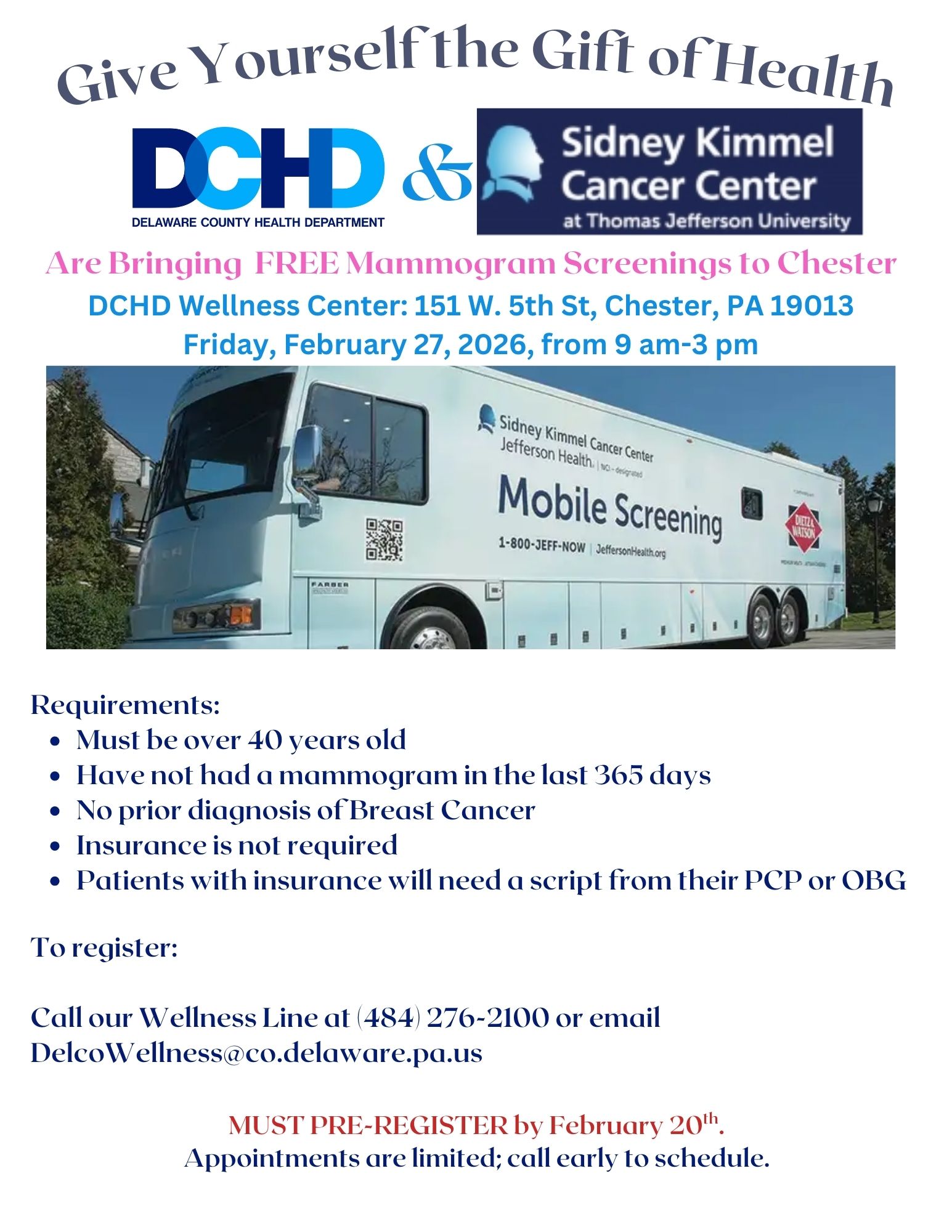 Where: DCHD Wellness Center, 151 W. 5th Street, Chester, Pa 19013