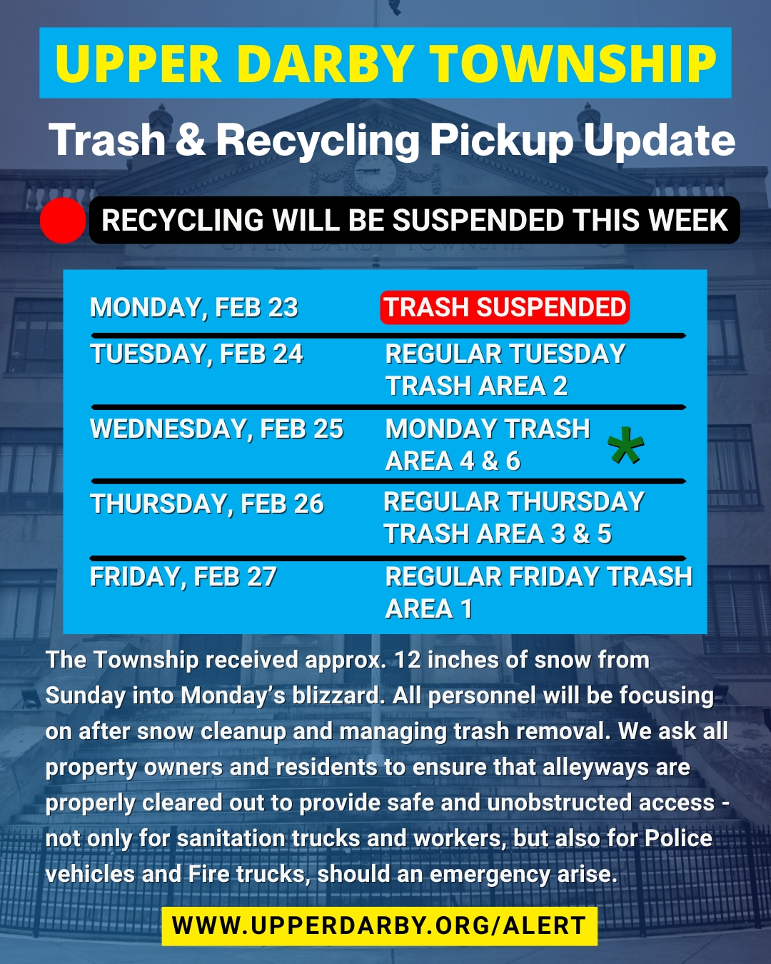 Wednesday, Feb 25: Monday Trash Area 4& 6, Recycling Suspended