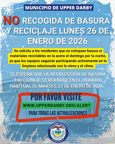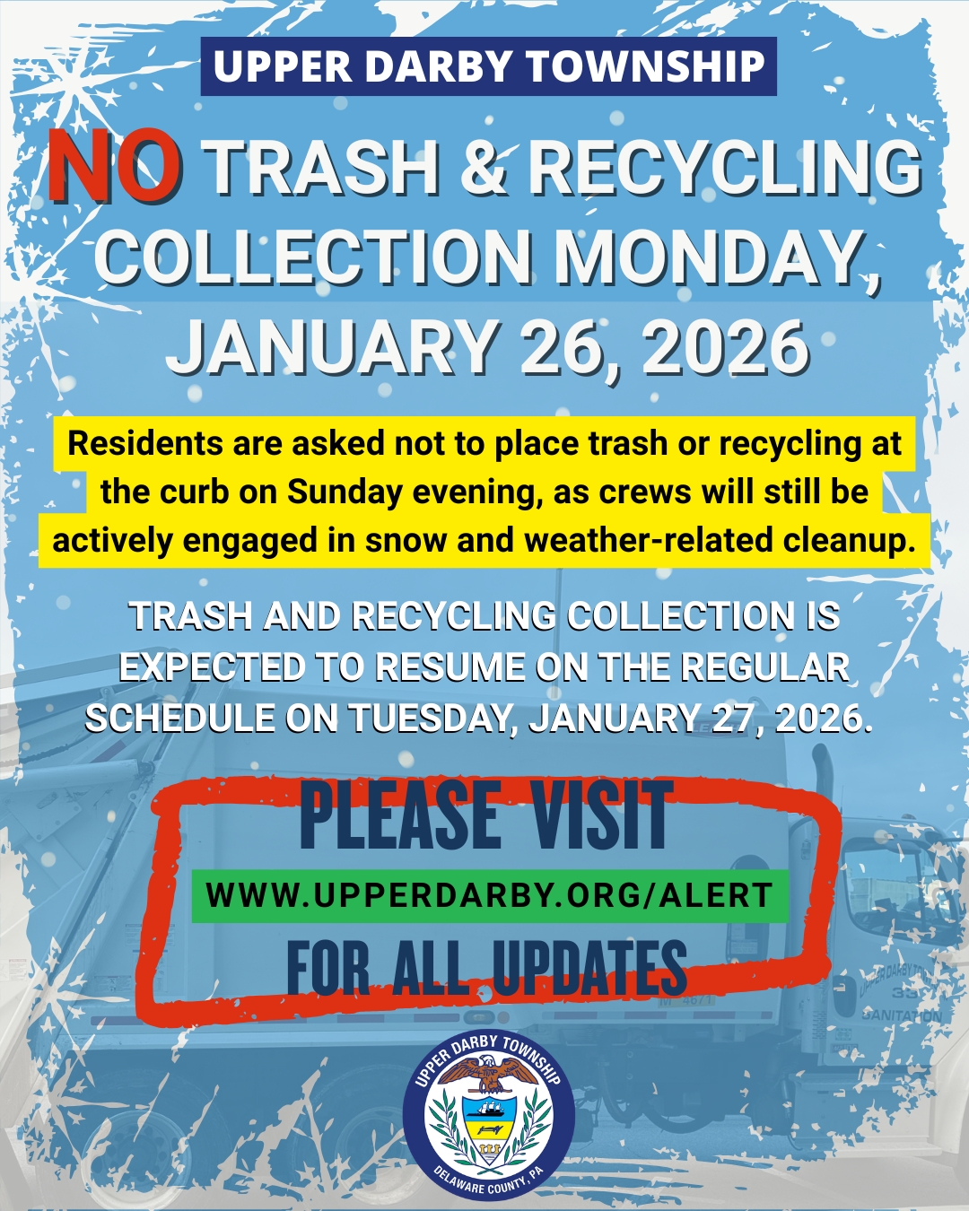 Due to inclement weather impacting roadways and alleys, Upper Darby Township will suspend trash and recycling services on Monday, January 26, 2026.