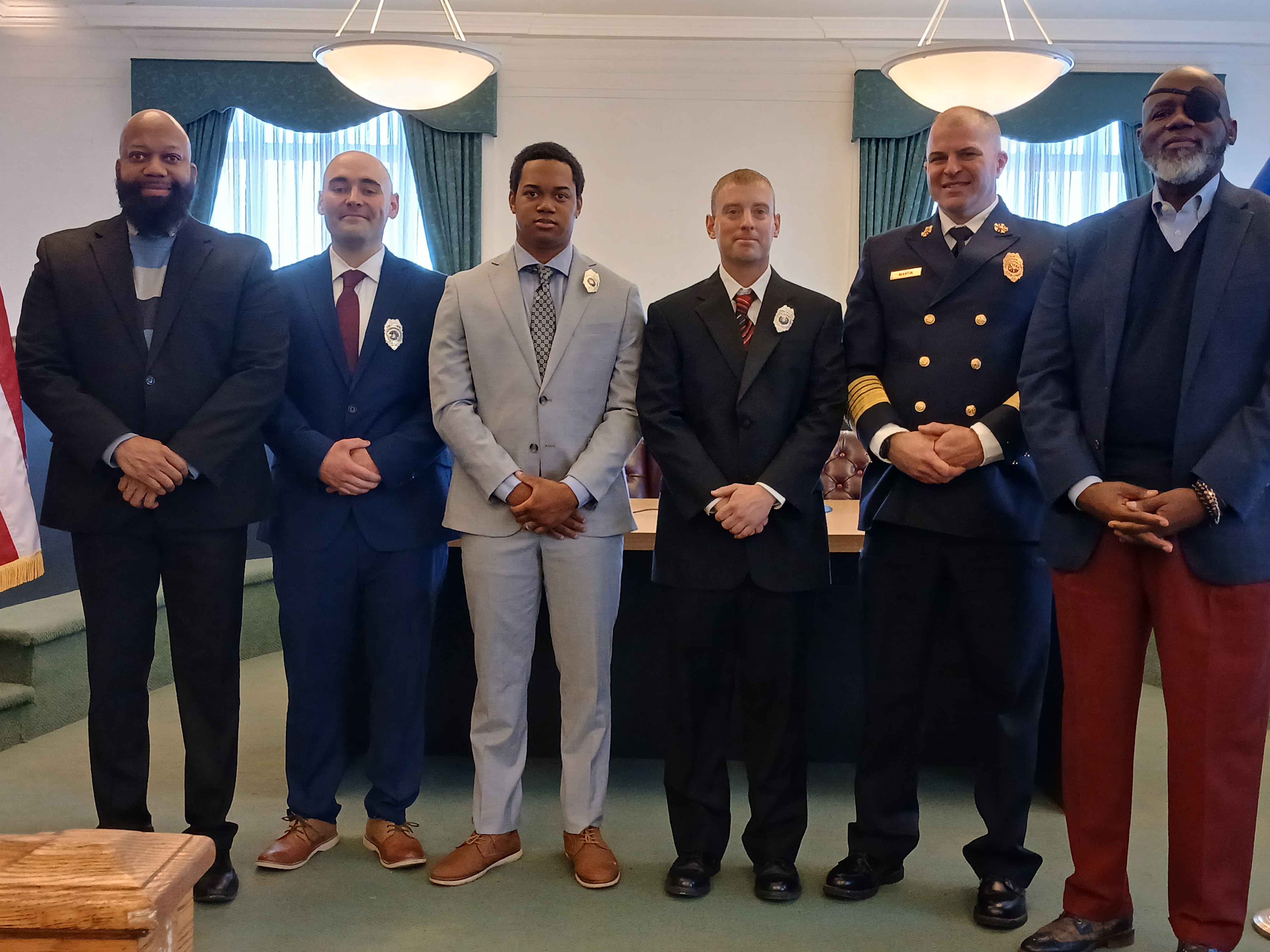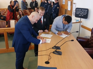 Mayor Ed Brown swore in Joshua Mason, Zachary Litwin, and Kestin Wiemer as Probationary Firefighters.