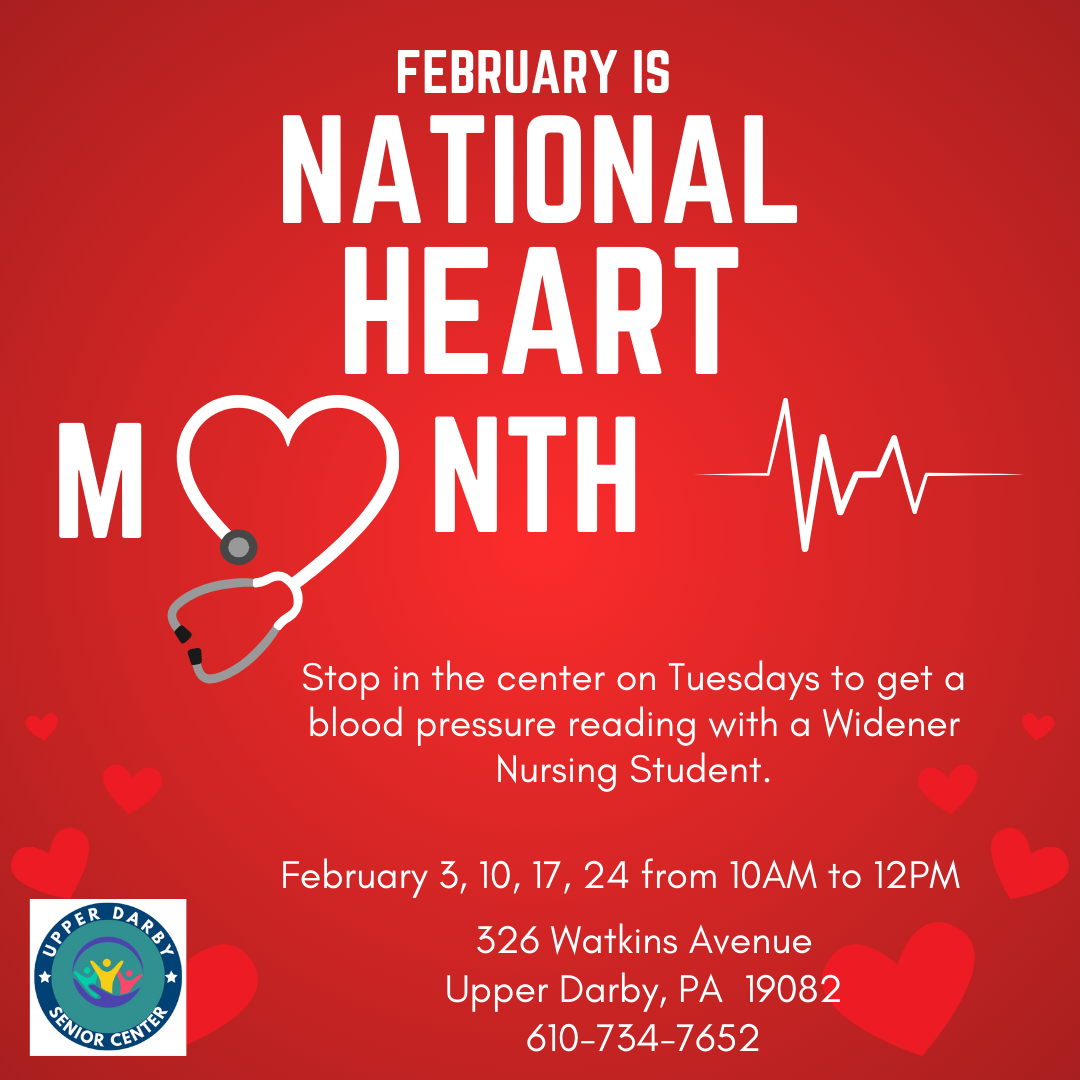 Celebrate National Heart Month this February at Upper Darby Senior Center! Stop by on Tuesdays for a complimentary blood pressure reading provided by a Widener University nursing student.