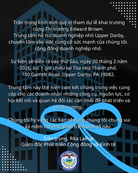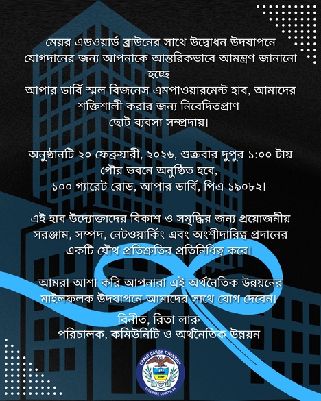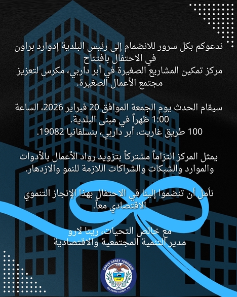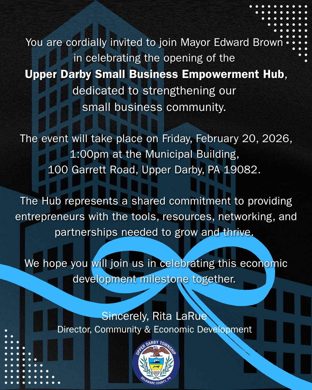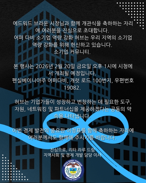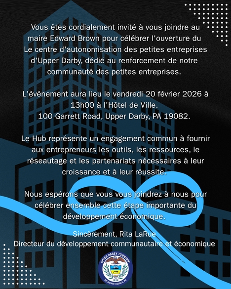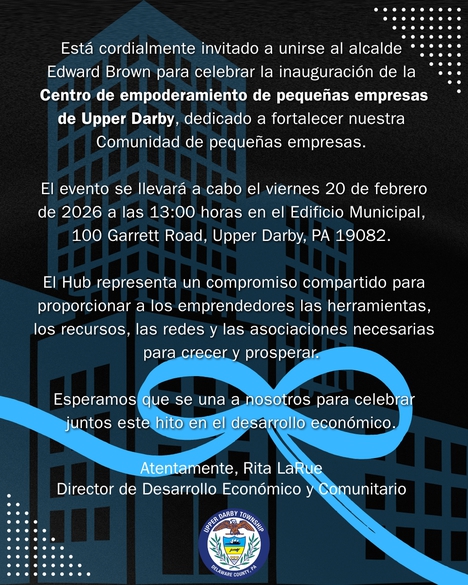 Please join Mayor Edward Brown in celebrating the opening of the Upper Darby Small Business Empowerment Hub, dedicated to strengthening our small business community.