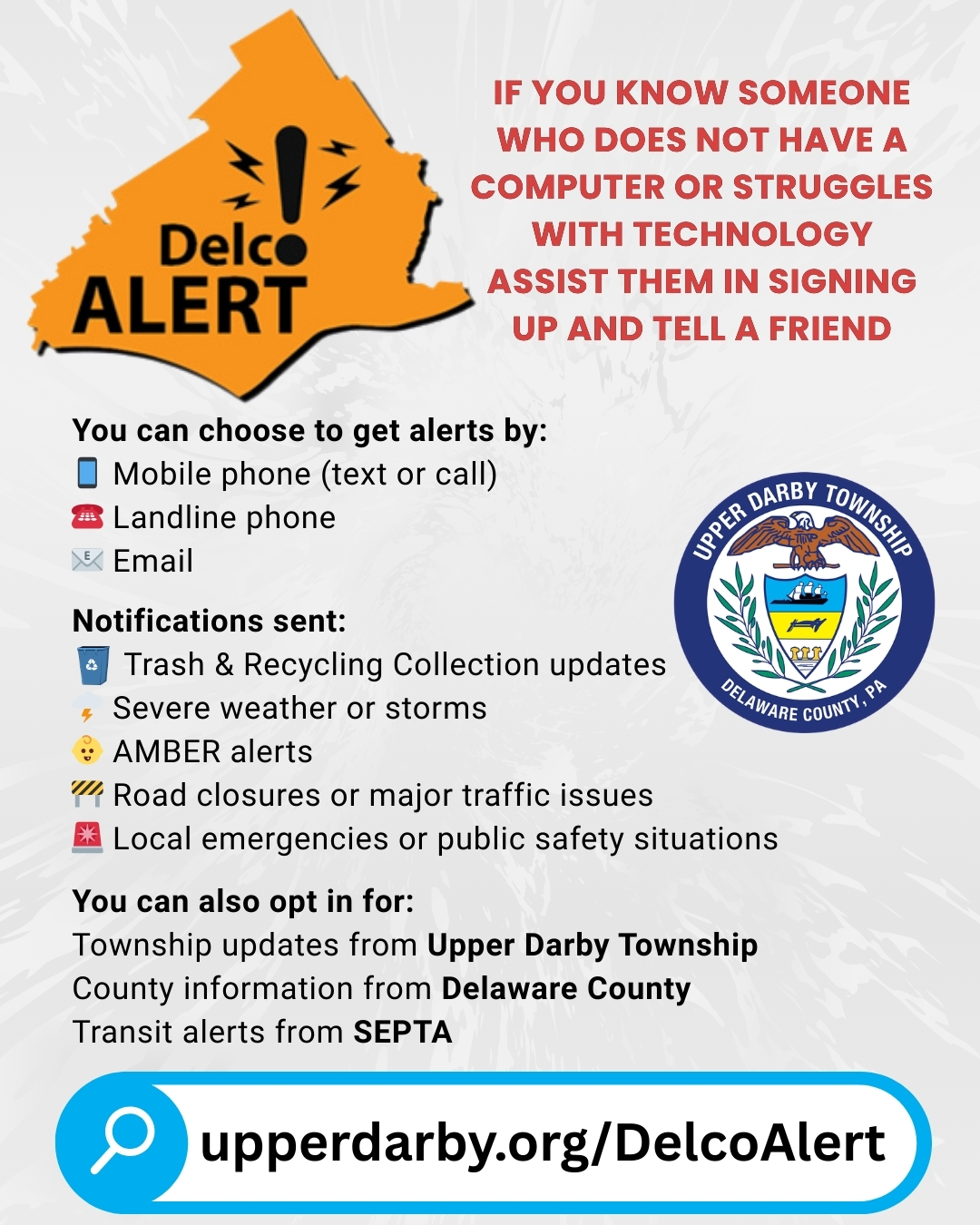 Upper Darby Township utilizes the Delco Alert System to provide important updates to residents. A Delco Alert is an emergency notification system that cautions Delaware County residents regarding impactful events. Such as a severe storm, an Amber alert, road closures, or another emergency situation.