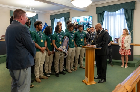 Mayor Ed Brown acknowledged and paid tribute to the school’s first-ever State Championship in basketball and proclaimed, April 15, 2026, Monsignor Bonner-Archbishop Prendergast Boys Basketball Team Day.