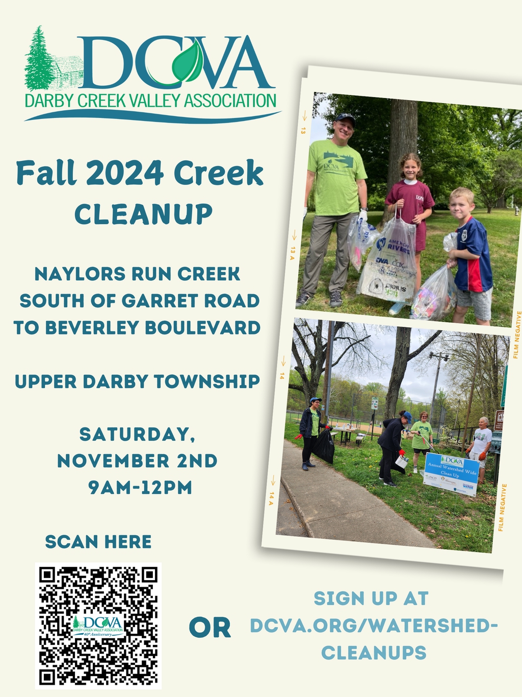 Naylor's Run Fall 2024 Creek Cleanup with the Darby Creek Valley Association. Saturday, November 2, 20249am to 12pmNaylor's Run Creek South of Garrett Road to Beverly BoulevardUpper Darby Township Sign up at DCVA.org/watershed-cleanups